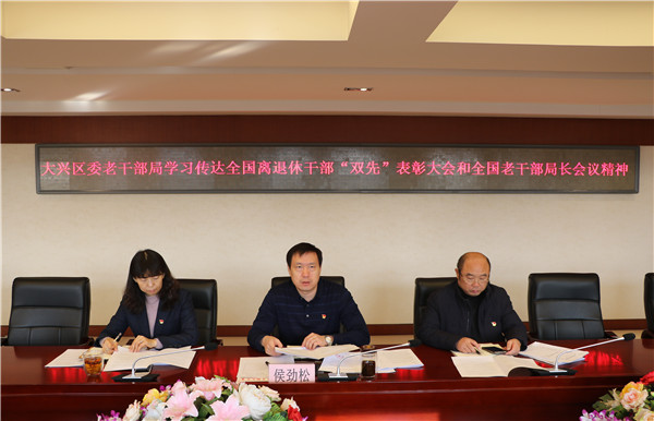 区委组织部副部长、老干部局局长侯劲松同志会上带领大家原文学习了陈希同志在全国离退休干部先进集体和先进个人表彰大会上的讲话、姜信治同志在全国老干部局长会议上的讲话,以及许宏彬同志在全国老干部局长会议上的总结讲话精神,联系大兴区实际进行深入解读,并提出要求:一是突出思想政治引领,深入学习习近平新时代中国特色社会主义思想,认真贯彻总书记关于老干部工作的重要论述,深刻领会和贯彻落实全国离退休干部“双先”表彰大会和全国老干部局长会议精神,牢牢把握老干部工作的正确方向。二是明确老干部工作的新部署新要求。要认真研读陈希同志和姜信治同志讲话的精神,认真思考贯彻落实的实际举措,切实把会议精神落实到各项具体工作中。三是要统筹力量,整合资源,推动党建引领老干部工作向基层延伸,不断开创新时代老干部工作新局面。