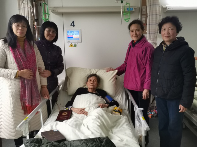 2019年12月23日,曹文红主任、唐鹃主席来到了南京鼓楼医院,把这枚承载着党和国家对老革命关心和爱护的纪念章送到了今年已经90岁的张桂茵老人手中,同时表达了学校、工会对张桂茵老人无限的敬意,诚挚祝愿老人早日康复,安享晚年。