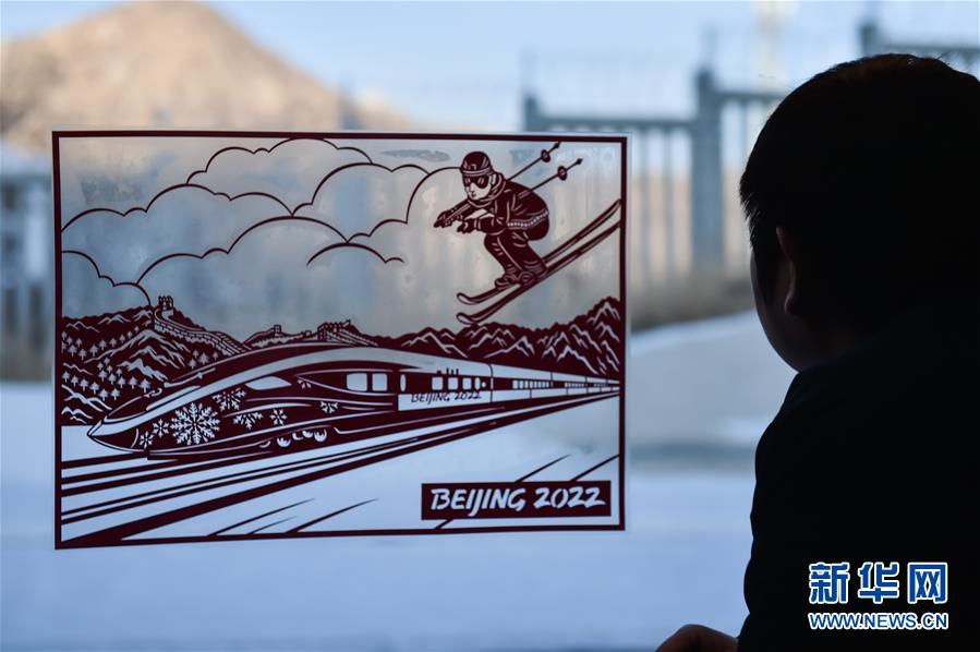 12月30日,在北京北站开往太子城站的G8811次列车上,一名乘客望向窗外。车窗上贴着2022年北京冬奥会主题的剪纸。新华社发(彭子洋摄)