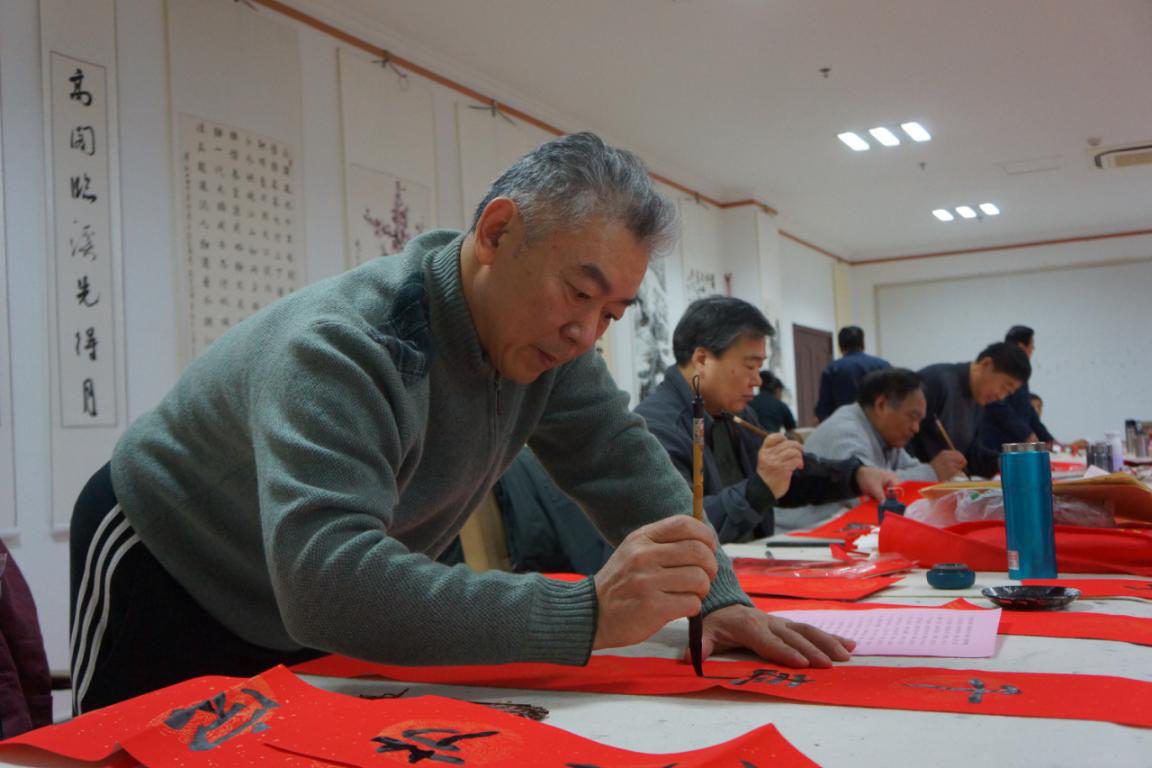 1月7日,滨州市老干部活动中心书画室内喜气洋洋,老干部书法爱好者们聚在一起写春联,迎新春,送祝福。窗外漫天飞雪,室内翰墨飘香,红红的春联,大大的福字,老干部们沐雨而来,踏雪而归,创作了100余幅春联,200余张福字,找到了久违的年味,送出了满满的祝福。