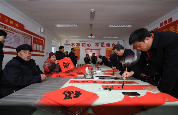 一大早,书法社成员们兵分三路,分别奔赴青云店镇三村二、四村和东孙村进行现场创作。各村委会人头攒动、书墨飘香。学员们挥毫泼墨,一幅幅饱满喜庆的福字、一对对吉祥如意的春联,增添了浓浓的喜庆氛围。仅半天时间,学员们共创作并送出春联、福字多达1000多幅,受到大家的热烈欢迎和一致赞扬。
