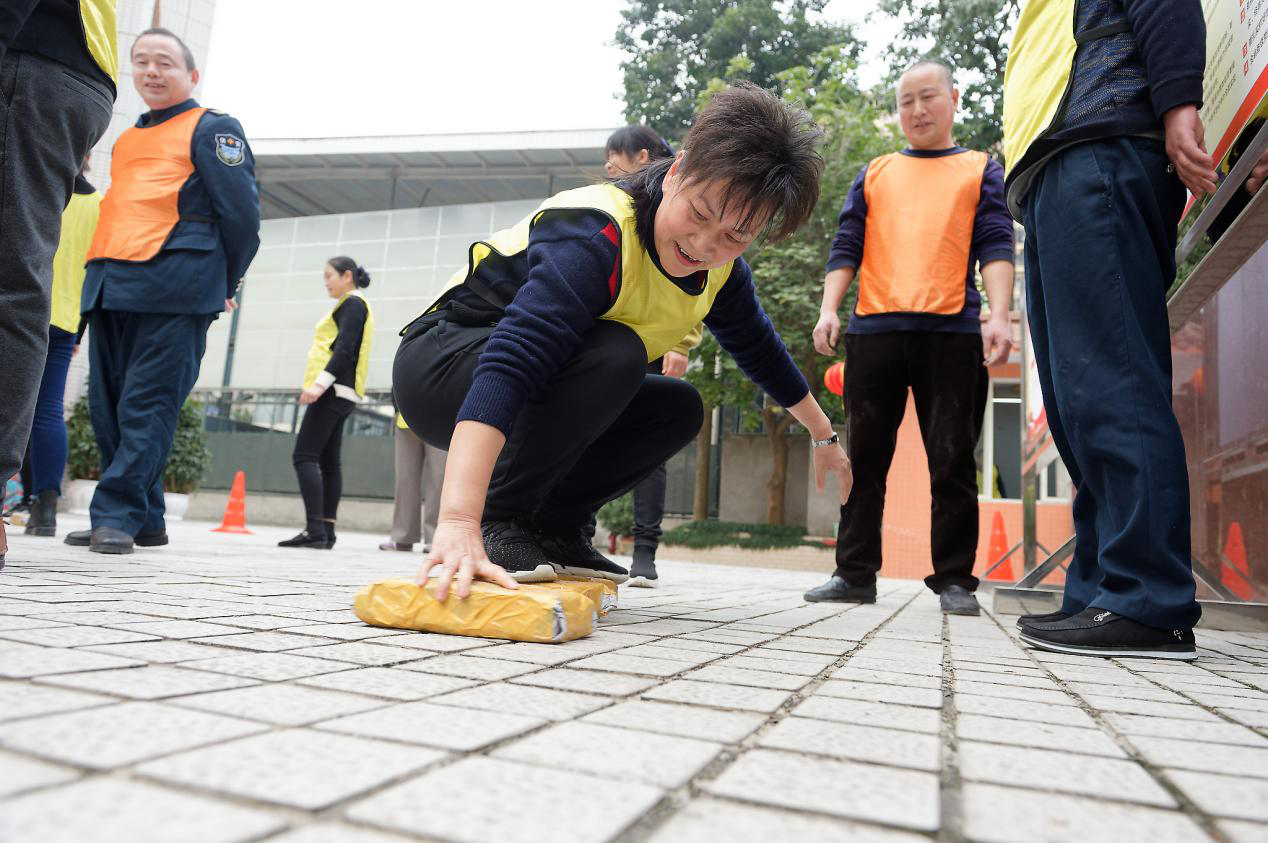 “砖”心致志环节,两组队员依次脚踩经过软包装的砖头,在对方队员震耳欲聋“干扰”声中聚精会神地将三块砖头“搬运”到对面,对面队员又依样运过来,以最短时间完成任务获胜。
