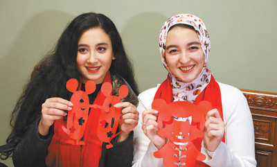 当地时间1月21日,“中埃共欢庆 同过中国年”主题春节文化体验活动在埃及首都开罗举办。图为当地两名参与者展示自己完成的剪纸。 本报记者 周 輖摄