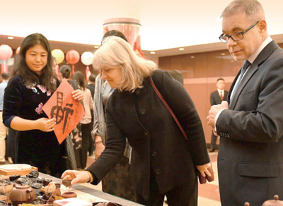 当地时间1月21日,中国常驻联合国代表团举行2020年新春招待会。图为嘉宾在品功夫茶。 本报记者 李 凉摄