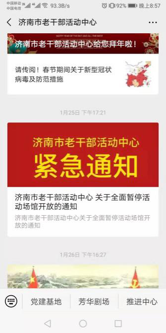 三是暂停各类活动。鉴于目前新型冠状病毒感染的肺炎疫情防控形势严峻和老年人属易感人群的特性,最大化减少因人员流动和聚集,产生疫情扩散的风险,切实保障广大老同志和老年学员的身体健康和生命安全,全面暂停全市各级老年人大学、老干部活动中心、芳华剧场等学习活动场所开放,济南老年人大学及时发布公告,暂停节后学员现场缴费等。
