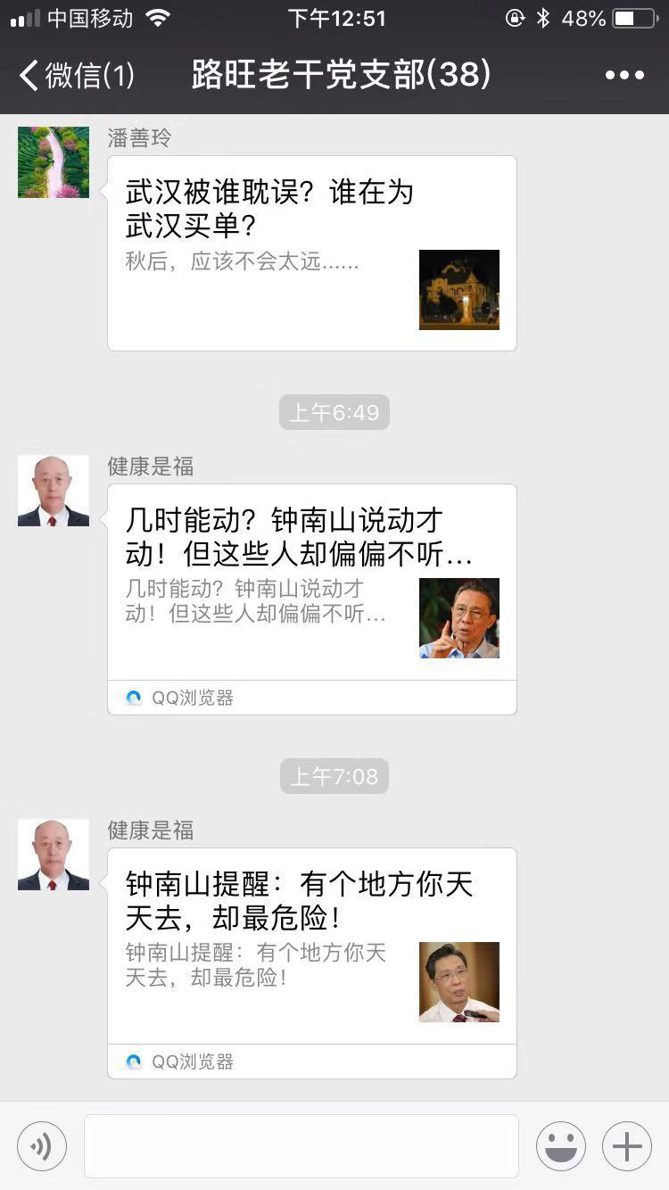 路旺离退休党支部贾焕海、祝夕厚、宋元才、潘珊玲、戴洪玺等5位老同志在新型冠状肺炎袭来之时,利用路旺老干部群、路旺教师群等多个渠道,每天在微信上发布各种疫情消息,告诫大家提高思想认识,积极行动起来战疫魔,更加坚定了全体离退休人员战胜病魔的信心和决心。