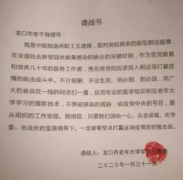 积极参与一线防控。假期中,全系统工作人员取消休假,战斗在抗击疫情的第一线。在龙口市“东大门”黄城集,老干部工作者不顾严寒24小时坚守在劝返点,登记人员信息、检查来往车辆,劝返外来人员,坚决堵住疫情输入通道。在社区,广大老干部、老党员也积极参与到社区疫情防控工作中。中医院退休干部、老年大学学员王速腾向组织递交了《请战书》,他说,“作为受党教育和培养几十年的医务工作者,责无旁贷应该投入到这场疫情阻击战中。不计报酬、不论生死、用必到、到必战”“我相信,只要我们团结一心,众志成城,在市委市政府的坚强领导下,一定能够坚决打赢这场疫情防控阻击战。”