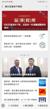 通过微信公众号向全区广大离退休老干部发出温馨提醒,号召老同志们加强防护、发挥作用,正确认知疫情,全力支持区委区政府开展工作,带头宣传,为控制疫情做出实实在在贡献。