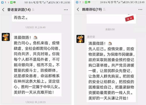 区离退休干部网宣达人、晚晴诗社功能型党支部书记、普老宣讲团成员袁芳荣每日撰写“清晨微语”短文,发布在各区离退休干部微信群和个人微博上,对防疫抗疫作正确引导。同时向区老干部晚晴诗社全体老党员发出号召,鼓励大家发挥诗社特点,力所能及大力传递正能量。