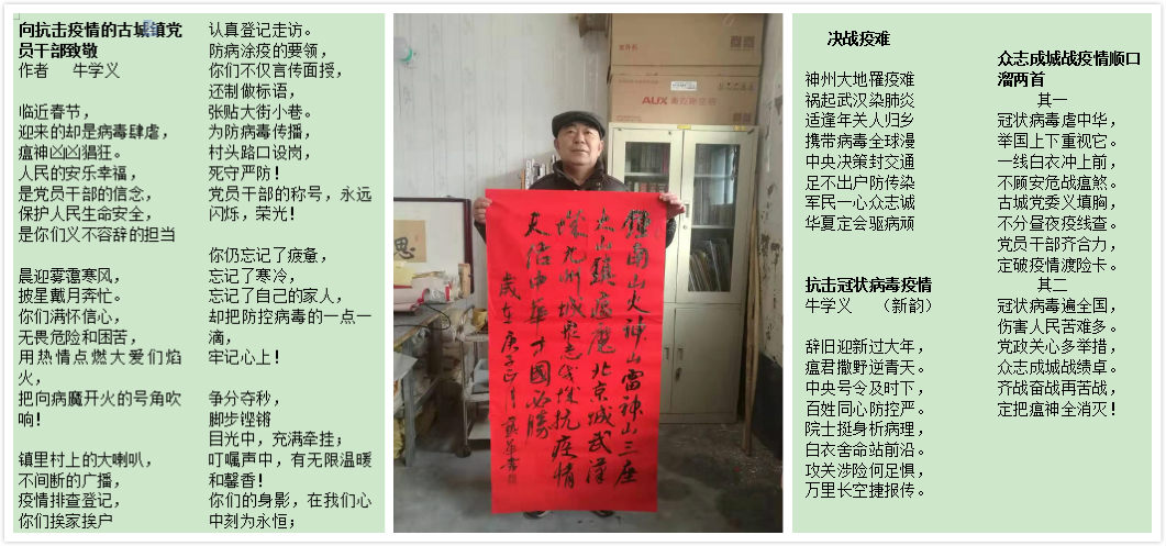 “现在镇里的、村里的干部都奋战在一线,别的我也不擅长,写点字画还凑合,希望能为他们加油鼓劲!”退休教师王艺华向记者说道。同王艺华一样,牛学义、陈文柱等老同志也积极通过诗词创作向奋战在一线的战士们表示鼓励,疫情发生以来,他们已精心创作诗词、曲作40余首,通过微信群广泛传播,用群众喜闻乐见的方式宣传防疫知识,鼓舞基层党员干部群众积极奋战。