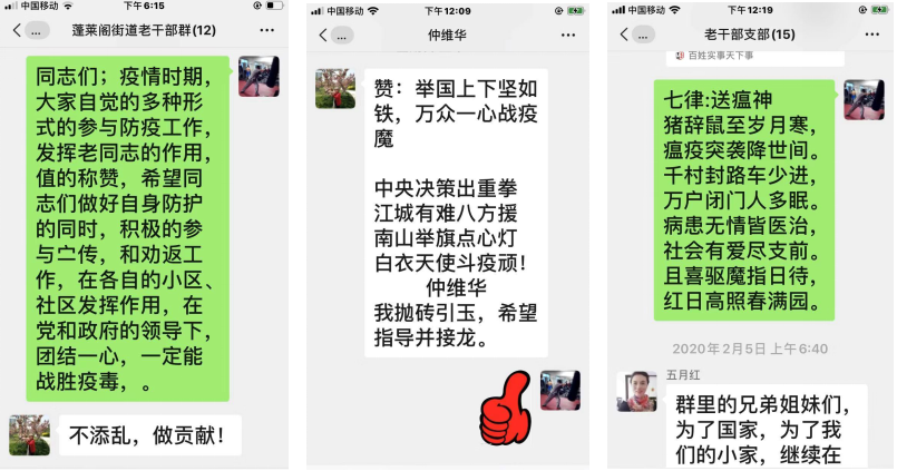 像时广盛这样的老干部党员,在蓬莱阁街道还有很多。有的编写抗疫诗歌接龙,在微信里转发,稳定人心鼓舞斗志;有的在村里劝解耐不住性子的群众,做好居家隔离;有的在朋友圈转发正能量文章,为抗疫加油鼓劲。