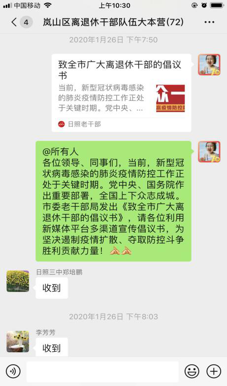 春节时期的“特殊问候”。岚山区委组织部、区委老干部局第一时间转发市委老干部局《致全市广大离退休干部的倡议书》,发动全区老干部工作者采取微信、短信、电话等形式宣传政策措施和防控知识,引导全区离退休干部维护防疫工作大局,增强病毒防范意识,提高抵御能力,科学做好防范;鼓励有条件的老同志积极作为,切实发挥正能量,有序参与群防群控工作。