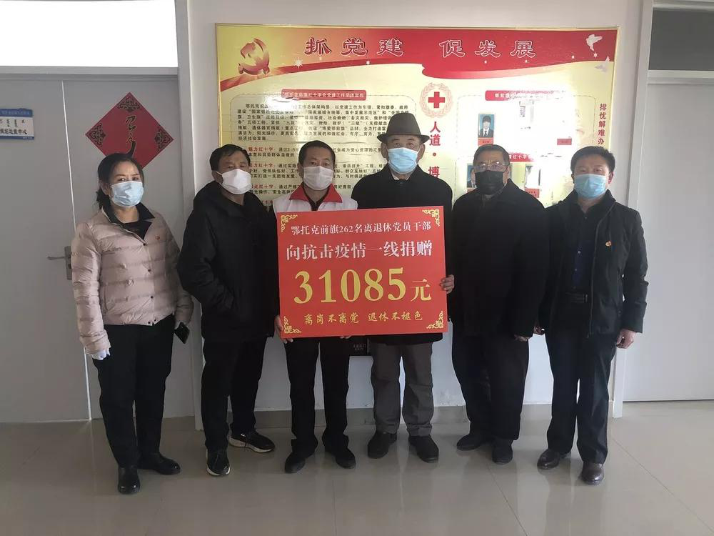 疫无情人有情,主动捐助支援一线。疫情的蔓延态势和医疗防控物资的紧缺让老同志们心急如焚,他们都想献上自己的一份爱心,为抗击疫情贡献自己的一份力量。有着70年党龄、97岁的抗战离休干部张万全每天通过电视、广播关心了解疫情最新进展情况,不停地催促家人联系捐助事宜,最终通过红十字会向武汉捐款1万元钱。在他的感召下,他的儿子、儿媳也捐赠1000元用于疫情防控。65岁的杭锦旗蒙古族中学退休教师达楞太身体一直不是很好,才不久做了手术,目前还在医院长期透析。作为党员,为支援疫情防控工作,达楞太向红十字会捐款1万元。还有全国离退休干部先进个人韩学士同志向党组织缴纳特殊党费5000元、市委统战部退休干部石忠勤向党组织缴纳特殊党费2000元,等等。基层离退休干部党组织也立即行动起来,充分发挥战斗堡垒作用和老党员先锋模范作用,发起了“捐资抗疫”活动。截止目前,杭锦旗237名离退休干部党员捐款1.57万余元,鄂托克前旗262名离退休干部党员捐款31085元,伊金霍洛旗老年大学73名学员捐款21140元。一笔笔爱心捐献,体现了老同志万众一心、共度难关的决心和信心。