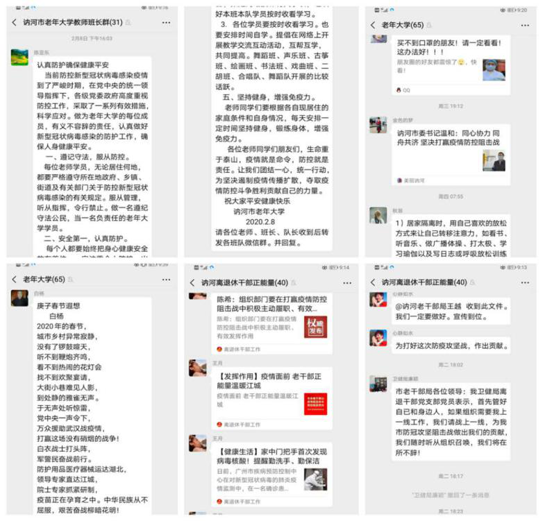 在这次疫情防控期间,老干部服务中心利用电话沟通、微信群发信息等方法,及时宣传党中央关于疫情防控工作重要指示精神,转发官方发布的准确信息,宣传疫情防控指挥部的工作部署,宣传疫情防控工作措施和成效,并及时了解老干部的生活状况和困难需求,再三叮嘱老同志加强自我防护,坚定信心,保持良好心态,按照《致全市离退休干部的一封信》要求,在疫情防控中进一步彰显老干部的优良作风,传递正能量。老同志们纷纷表示,疫情防控关系千家万户,是当前头等大事,我们对市委、市政府有信心,同时做为一名老干部、老党员一定坚决响应市委、市政府号召,以身作则,率先垂范,进一步做好自身防护工作的基础上,发挥余热,老有所为,争做抗击疫情的坚守者、示范者、引领者。