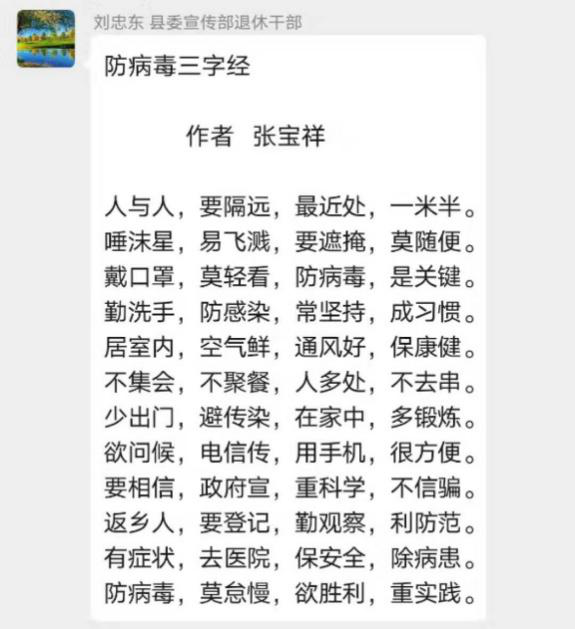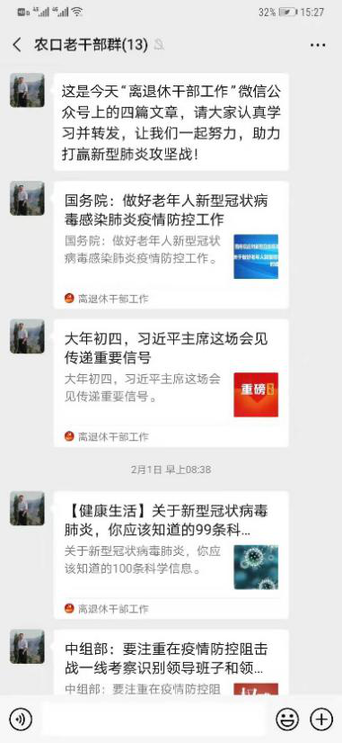 疫情防控期间,全县广大老同志积极学习使用网络媒体,主动发声,传递正能量,努力做好防范疫情的宣传员。在微信、今日头条、抖音等新媒体平台积极转发官方疫情通报、疫情防范等正面宣传贴文,引导老同志不要恐慌,科学防范。同时,加大对老同志微信群的管理维护,引导老同志以官方消息为准,不造谣、不信谣、不传谣。目前转发防范帖文265篇,警示老同志23人次,与老同志互动交流511人次。