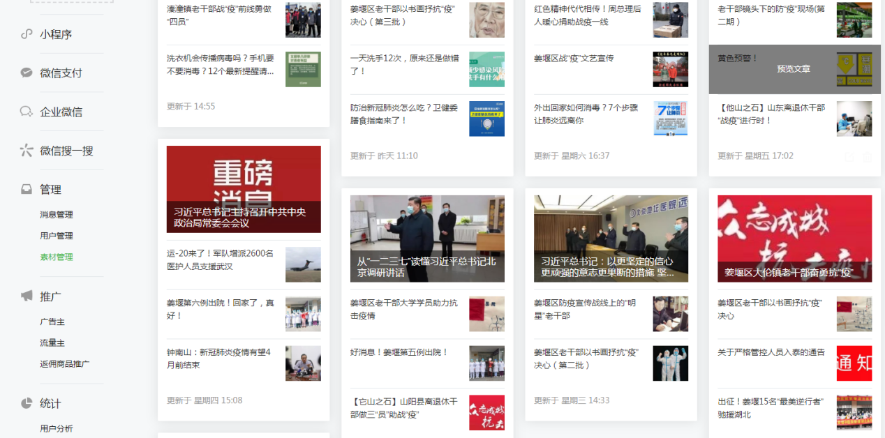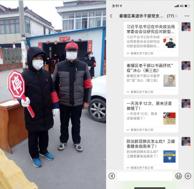 一是用好网媒,强化疫情宣传。防疫期间,该局坚持每天更新“姜堰区老干部之家”微信公众号,内容主要包括关于疫情防控的政策文件、疫情防护的相关知识、全区老干部在疫情防控期间发挥作用的先进典型和事迹等。坚持在“姜堰区离退休干部党支部书记工作群”中推送疫情防控的最新讯息。各离退休干部党支部书记也都能够及时将相关讯息转发到本支部老干部工作微信群中,确保全区离退休干部都能及时学习相关政策文件和防护知识,从而更好的保护自己、服从管理,增强做好疫情防控工作意识。