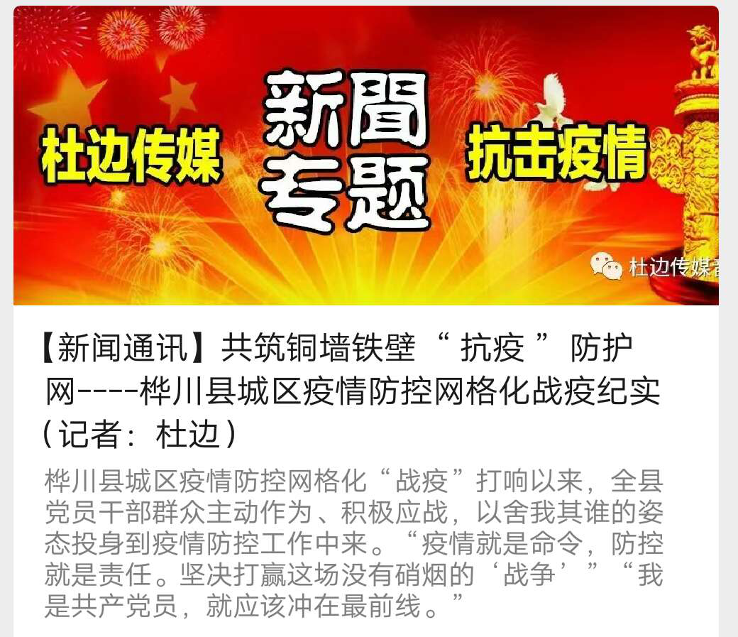 按照县委宣传部和离退休干部党工委的工作部署,杜边利用创办的自媒体《杜边传媒》微信平台,加大了对新冠肺炎疫情防控的宣传报道力度,第一时间开辟《杜边传媒抗疫情新闻直击》《众志成城抗疫情特别节目》《文旅“抗疫情”专题》《文学艺术“抗疫情”作品展播》《杜边传媒“新闻在线”抗击疫情》等栏目,采编发布了《总有一束光能够冲破黑暗》《桦川万众一心坚决打赢防控阻击战》《共筑铜墙铁壁防护网·桦川县城区疫情防控网格化战“疫”纪实》等生动鲜活的信息,让群众足不出户便能了解疫情动态,增强防控意识,将真实故事、权威信息传递给宅家的老百姓。为了确保报道生动及时,他经常在工作室通宵奋战,用群众听得懂的语言、容易接受的方式撰写新闻报道、编辑视频。疫情发生以来,共采编发布在线新闻15条,发布文化志愿者抗疫主旋律原创歌曲、文艺展播、抗疫主题快板及诗朗诵视频图文播报22期,转发《学习强国》平台文章和官媒发布的新闻链接15条,累计微友阅读关注量达8万人次,有效凝聚了众志成城抗击疫情的新闻和文化力量,传播了正能量。