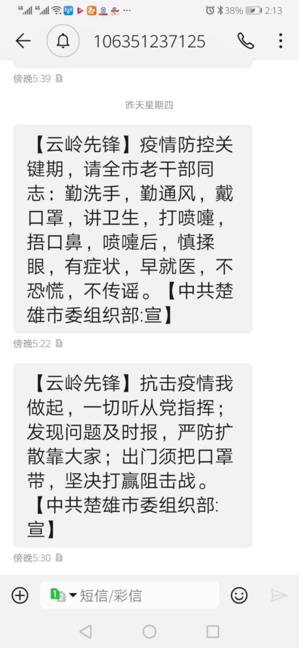 强化宣传引领,服务方式精准有效。市委组织部将加强思想政治引领工作放在首要位置,坚持“不聚集、少见面”的原则,创新运用云岭先锋平台、“威楚先锋”“楚雄市老干部工作”微信公众号等信息化手段,精准推送《致全市离退休老干部及老干部工作者的一封信》《致全市离退休老干部和家属的慰问信》,并把党中央和省州市党委疫情防控官方信息和要求及时准确传达到每一位离退休老同志。截止目前,已累计发送疫情防控有关信息4000多条,通过主动宣传教育,引导广大离退休老同志科学正确认识疫情,不信谣、不传谣,主动带头遵守疫情防控各项要求,做好居家防控,同时通过老干部的影响力教育引导亲戚朋友坚决拥护和模范支持党中央和省、州、市党委的部署要求,进一步坚定打赢疫情防控阻击战的信心。市司法局退休干部冯嘉成颇有感触的说:“日常生活受到一定影响,非常感谢党、感谢组织的关心帮助,我们一定会带头遵守疫情防控相关要求,积极发挥正能量,教育家属子女积极投参与疫情防控工作,为打赢打赢疫情防控阻击战贡献力量。”