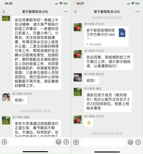 假期前后,通过电话联系全市离休干部和市级老领导,希望他们强化自我保护意识,积极教育引导子女及家人,并带动亲友共同做好疫情防护工作。目前,已建立14个老干部家属微信群,局机关工作人员及时向个人结对联系老干部的子女发送安全提示、疫情通报、医疗服务等信息。建立余姚老干部工作微信群、社区老干部工作人员微信群等,通过老干部原单位工作人员、社区工作人员的信息传递,切实引导老干部及老干部工作人员做好自身及家人防护工作。同时,为物资不足、药物缺乏、外出不便的离休干部提供送药送物上门服务。