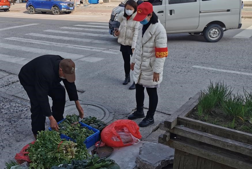 在镇区主要街道,针对几位老人沿街卖菜的违规经营行为,党员志愿者一边劝说其到附近菜市场集中经营,一边自掏腰包买下老人销售的蔬菜。