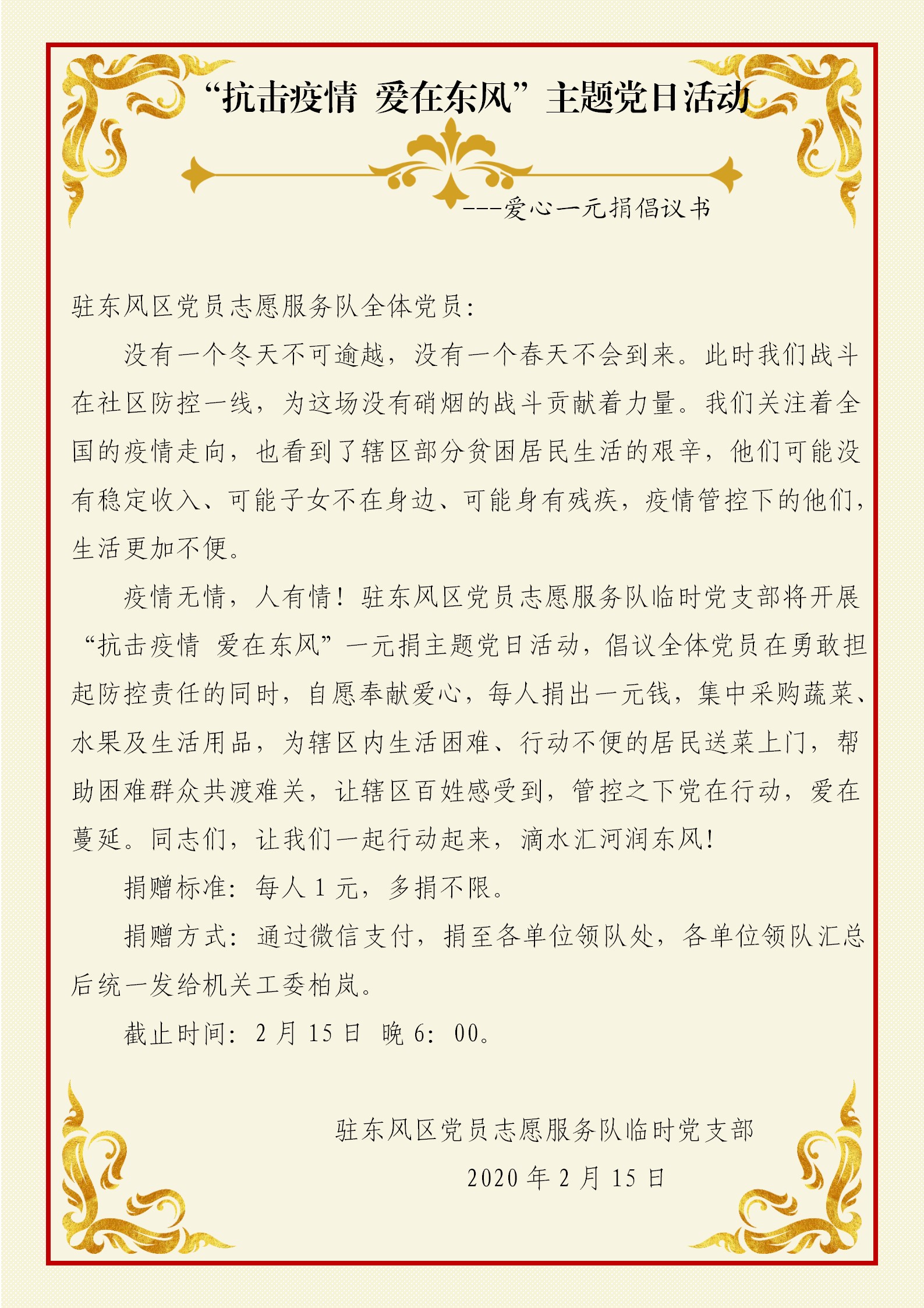 驻守,他是自找麻烦的“多事儿者”。徐鹤钧带队坚守在抗疫一线,不讲条件、不怕困难。在志愿服务工作中,他发现东风区困难居民多,很多人以拾荒、打零工为生,在疫情管控之下,生活很艰难。针对这一情况,徐鹤钧提出在志愿者中开展一次“一元捐”主题党日活动,大家捐款为贫困户送蔬菜,以解燃眉之急。在征求周围人意见的时候,有人劝他:大家都是来支援区里抗疫的,不是来扶贫的,你这不是没事找事吗?他却说“我们捐点钱、买点菜,也是帮助区里抗疫工作啊,这些困难居民能安心宅在家里,难道不是对抗疫工作的贡献吗?”在他的号召下,驻东风区党员志愿服务队临时党支部向全体党员志愿者发出“一元捐”的倡议,开展了“抗击疫情、爱在东风”主题党日活动,党员们踊跃捐款,2个小时捐款就达16520元。首批采购了4500余斤蔬菜,分装成160份,党员志愿者和社区工作人员为困难家庭送菜上门,同时送去了党和政府对他们的关心关爱,有效缓解了居民的生活难题,也切实减少了人员流动,更温暖了民心。在巡查工作时,他更是不分份内份外,看到的、遇上的、找来的各种问题,他都会过问,从不怕事多。在巡查路上,看到小区栅栏被人为破坏,他会联系区里的住建局,要求加固;遇到翻栅栏逃避卡口管理的人,他总是毫不犹豫地冲上去制止并说服教育;听说有居民生病不方便就医,他帮助联系医生电话问诊;街道主任说辖区有精神病患者到处乱窜,精神病院疫情期间又不收治患者,他就联系民政部门,协调院方出医生上门诊治、送药……佳木斯新闻、佳木斯日报等媒体多次报道东风区志愿服务队的防控抗疫事迹。