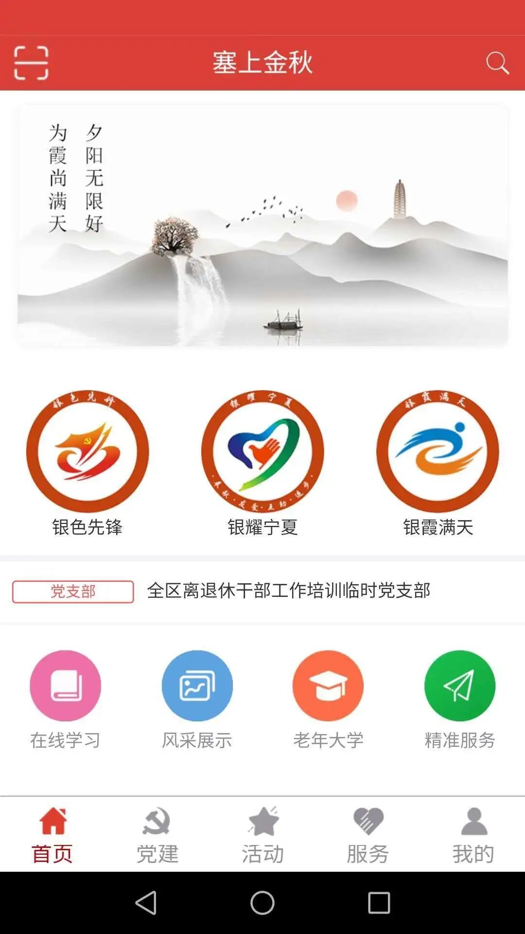 “塞上金秋”APP,是自治区党委老干部局于2019年9月份上线的一款致力于服务离退休干部的综合性信息平台,包括银色先锋、银耀宁夏、银霞满天、在线学习、风采展示、老年大学、精准服务七大功能板块。老同志们可以通过这一平台及时了解全区各地离退休干部发挥作用、开展活动的情况,也可以通过服务模块查询生活常识、家政服务、社保医疗,同时还可以借助这一平台报名上老年大学。