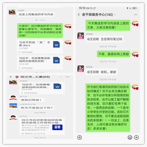 一是正面引导,抗“疫”情。自新冠病毒疫情发生以来,老干部服务中心充分利用“微”媒体,开展正面宣传引导工作,坚持每天在群内推送习近平总书记重要指示精神,党中央决策部署,市委、市政府相关工作要求,通报抗疫一线最新形势和战果,帮助老同志消除焦虑情绪、保持积极心态、增强必胜信心;积极向老干部推广使用“学习强国”学习平台,对APP下载安装注册方法步骤、操作使用相关事项和参与答题、累计积分等内容进行讲解,引导老同志从主流媒体上了解掌握防控知识,科学防控,理智对待网络传闻,不信谣、不传谣,增强打赢疫情防控战信心;教授老干部学录短视频,引导他们将创作的诗词、改编的舞蹈以短视频的方式进行宣传,为打赢疫情防控战贡献力量。