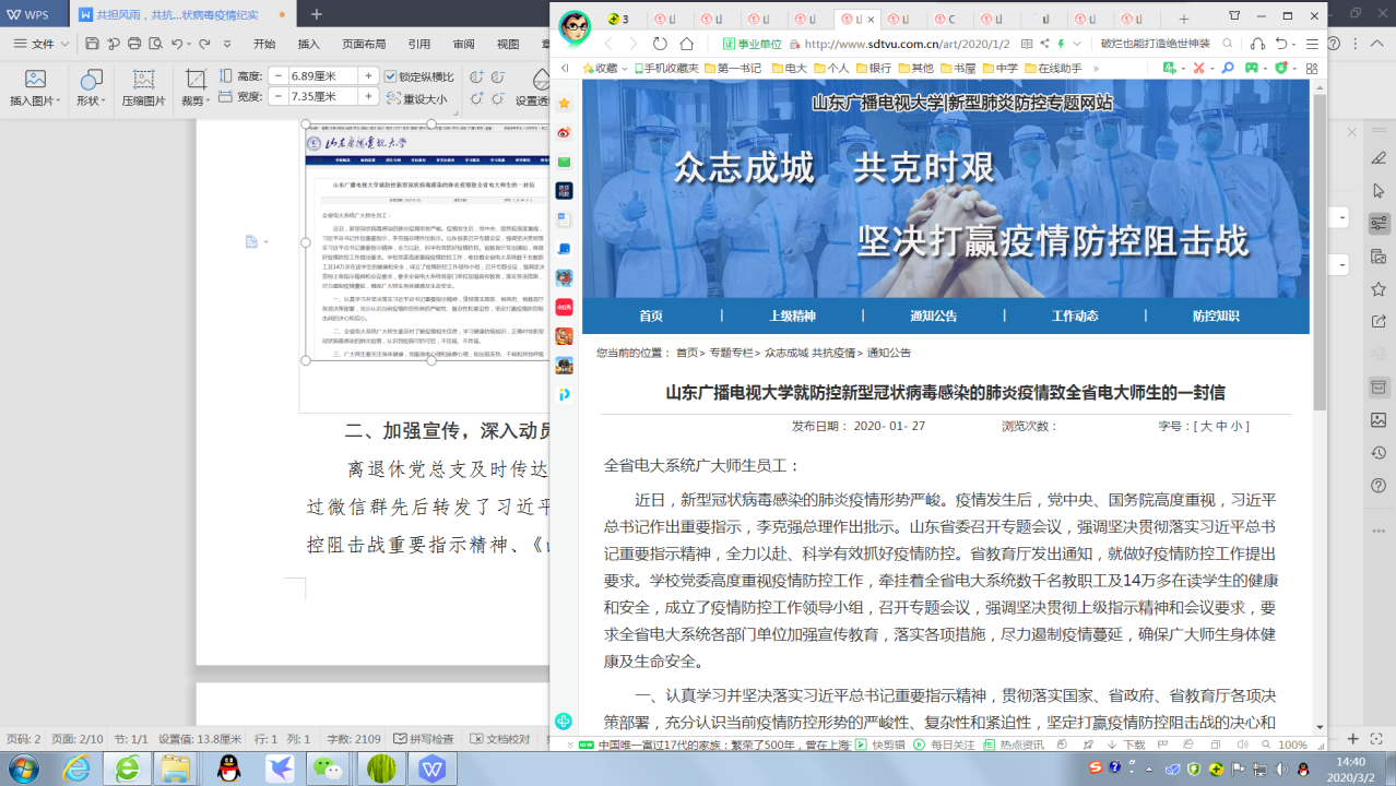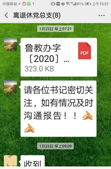 离退休党总支及时传达上级疫情防控的指示要求,在第一时间通过微信群先后转发了习近平总书记关于坚决打赢疫情防控阻击战重要指示精神、《山东省教育厅关于做好新型冠状病毒感染的肺炎疫情防控工作的紧急通知(鲁教办字【2020】)1号)》《山东广播电视大学就防控新型冠状病毒感染的肺炎疫情致全省电大师生的一封信》《山东广播电视大学新型冠状病毒感染的肺炎疫情防控工作方案》《关于坚决贯彻落实习近平总书记重要指示精神在打赢疫情防控阻击战中充分发挥党组织战斗保垒和党员先锋模范作用的通知》《关于进一步强化责任担当严格落实疫情防控措施的通知》《关于进一步强化新型冠状病毒肺炎疫情防控的通知》《致全校各级党组织和全体共产党员的倡议书》等指示要求,对疫情防控工作进行了全面安排部署,离退休党总支及各党支部书记每天保持线上工作、电话联系,及时发布疫情防控信息,掌握疫情防控情况,不断提醒离退休老同志们关注疫情、加强防范,做好家庭与个人的防护,认真做好疫情防控等情况报告。