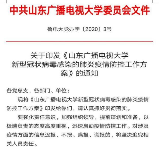 学校党委高度重视疫情防控工作,成立了以党委书记刘龙海、校长徐文谋为组长的疫情防控工作领导小组,制定了疫情防控工作方案,发布了《山东广播电视大学就防控新型冠状病毒感染的肺炎疫情致全省电大师生的一封信》等对疫情防控做出部署。