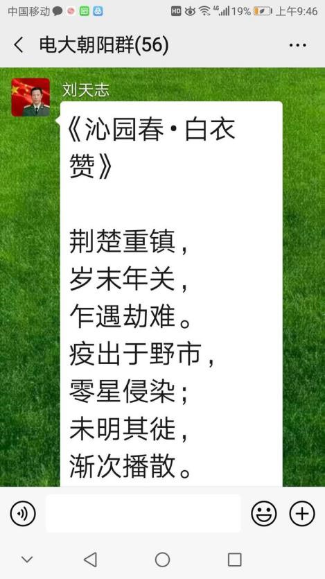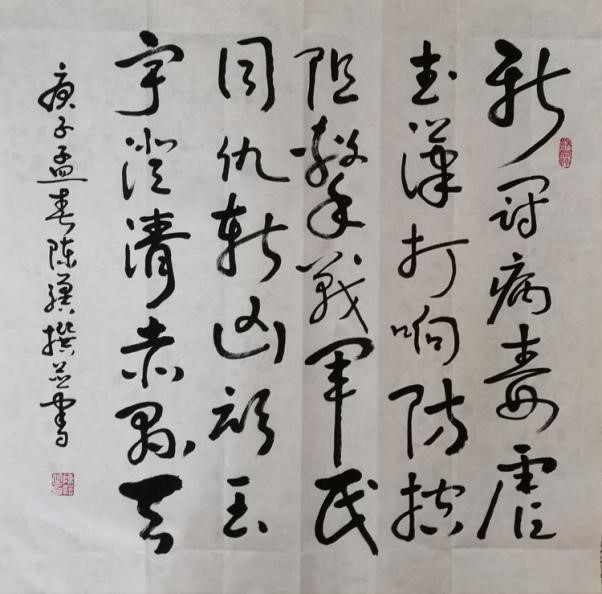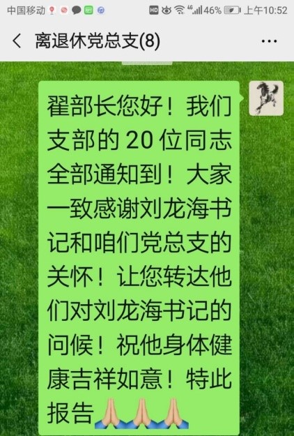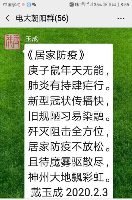 各党支部认真贯彻落实学校《新型冠状病毒感染的肺炎疫情防控工作方案》,通过微信、电话、短信向老同志们进行了传达和部署。老同志们纷纷响应学校号召,自觉落实防控措施,坚守家中,并纷纷在微信群中发布党和国家对疫情防控的决策部署、疫情实时动态、疫情防控措施等信息,相互提醒、相互鼓励,不信谣不传谣,不串门不集会,讲卫生勤洗手,少出门戴口罩,科学防治,主动服从和配合街道社区的工作安排,用实际行动助力疫情防控工作,积极发挥正能量。部分老同志在家中以书画形式、诗词朗诵、制作彩视等形式抒发坚决打赢疫情防控阻击战的期盼和信心,王秀娟同志在家中充满情感地朗诵毛泽东同志的《七律