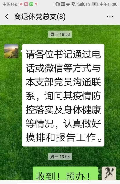 各党支部书记与离退休工作人员通过微信、电话等逐一联系了离退休党员、群众,详细询问了老同志们疫情防控落实及身体健康等情况,提醒老同志们做好疫情防护工作,将学校党委的关心和问候传达到每名老同志,个别生病住院的老同志的情况也通过其家属做了认真了解和记录,逐一做好了疫情摸排工作。通过联系、摸排,全校146名离退休老同志均平安稳定,并能够自觉做好疫情防护,确保身体健康。各党支部书记定期用微信、电话等形式询问老同志们的身体状况,帮助他们解决困难,做好疫情防控措施的落实及报告工作。