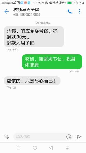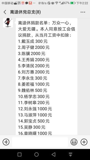 在学校开展“抗击疫情献爱心,为湖北武汉加油”募捐活动中,离退休党总支立即行动、安排部署,倡议离退休老同志自觉自愿捐款,离退休党员干部、职工积极响应,踊跃捐款,通过微信、电话等方式快速确认捐款信息,短短不到两天的时间就有72名离退休职工自愿捐款56900元,捐款2000元的11人、1000元的20人、500元的16人、100-300元的25人;其中,有67名党员捐款55500元,占捐款人数的93.1%,占捐款金额的97.5%。