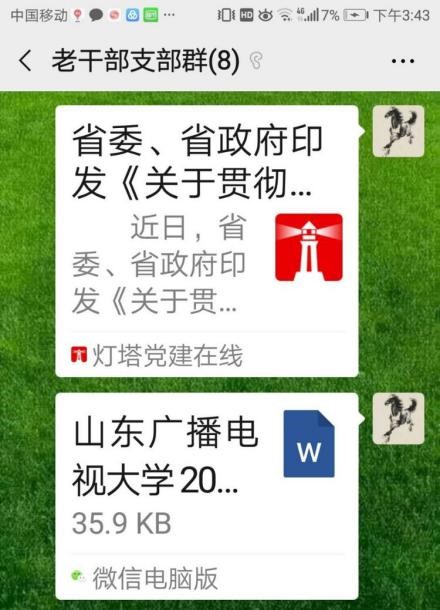 3月3日,离退休党总支在微信群转发了学校《关于组织开展“立足岗位守初心,抗击疫情担使命”主题党日活动的通知》,并上传了学习文件:(1)《习近平:在统筹推进新冠肺炎疫情防控和经济社会发展部署会议上的讲话》;(2)《省委、省政府印发〈关于贯彻落实习近平总书记重要讲话精神统筹推进新冠肺炎疫情防控和经济社会发展工作的若干意见〉》;(3)《山东广播电视大学2020年工作要点(征求意见稿)》。老干部党支部书记陈骥同志在老干部支部微信群里进行了转发,并发布了开展主题党日活动的预备通知,要求全体党员认真学习上级文件精神,充分做好准备,3月5日上午开展主题党日活动,开展学习交流,畅谈学习体会。