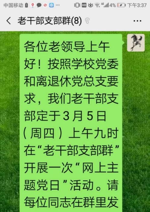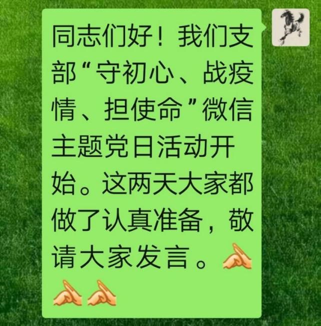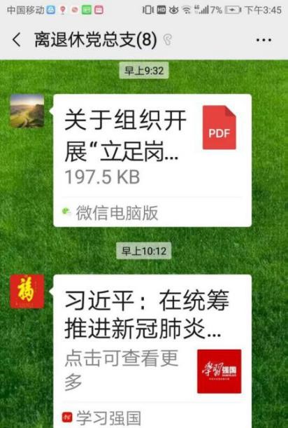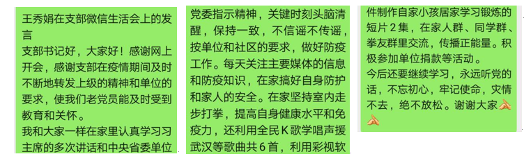 编者按:离退休老干部党支部利用微信开展主题党日活动,充分考虑了老党员年龄大、行动不便、居住分散、疫情防护等实际情况,创新了党建活动载体。这次微信主题党日活动富有成效,是老干部党支部党建工作“支部建在网上”的积极探索。