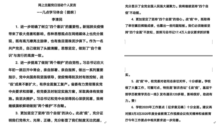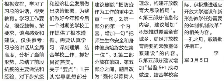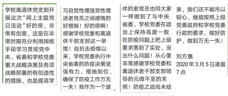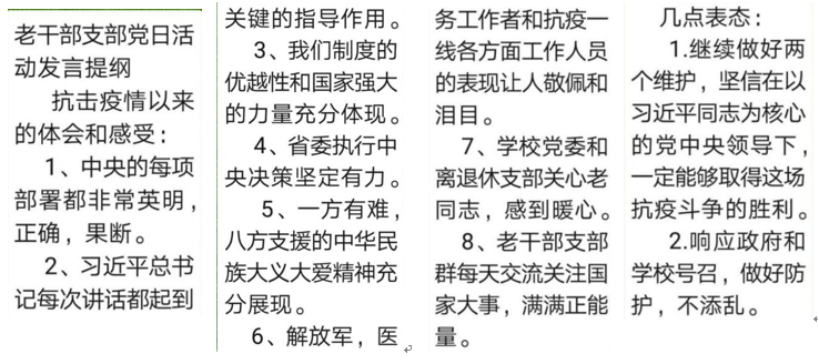 坚定“四个自信”、做到“两个维护”,模范遵守疫情防控纪律,把疫情防控的过程作为党性教育、党性锻炼、党员严格要求的过程,并号召离退休老同志在学校党委坚强领导下,以社区为战场,以支部为堡垒,以居家为战壕,以酒精口罩为武器,以亲人为战友,坚守防控阵地,落实疫情防控措施,为疫情防控做出积极贡献,让党的旗帜在疫情防控中高高飘扬。同时老同志们对学校2020年工作要点提出了修改建议。