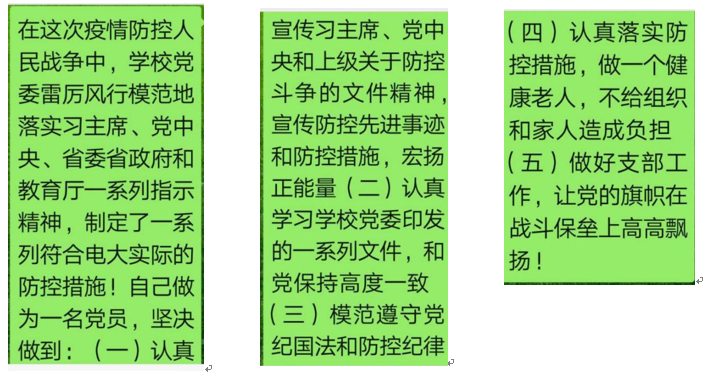 2020年3月5日上午,老干部党支部按照学校党委和离退休党总支的要求,利用微信群召开了“守初心,战疫情,担使命”主题党日活动。疫情就是命令,防控就是责任!离退休老同志代表王秀娟、李清民、薛伟平、刘方惠、周子健、王泺民、李军、陈骥等作了书面发言和视频发言,抒发了爱党爱国、战胜疫情的情怀。