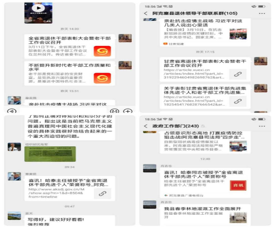 二是及时宣传先进典型。老干部活动中心通过微信公众号、微信群、QQ群、阿克塞县草原先锋网、政府工作部门联系群等网络平台,认真学习贯彻全省离退休表彰大会暨老干部工作会议精神,广泛宣传全国、全省“离退休干部先进个人”典型事迹,充分发挥获奖老干部示范带动作用,营造学先进、赶先进、争当先进的浓厚氛围。