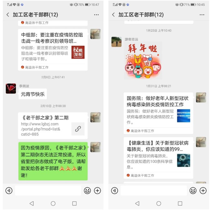 建立“老干部微信群”,组织老干部“线上”申报健康信息,摸清老干部健康底数及流动史、接触史,同时积极利用微信公众号等新媒体推送各级党委和卫生健康部门发布的权威防疫资讯,及时为老干部答疑解惑,引导老干部科学应对疫情,不信谣、不传谣。“线下”发动全区各单位以电话慰问等方式摸排本单位老干部健康状况等信息,重点关注有疑似症状、有高危流动史及居住在有确诊病例小区的老干部,并持续保持密切联系。同时,根据老同志需求认真做好日常用药、居家生活等亲情服务。