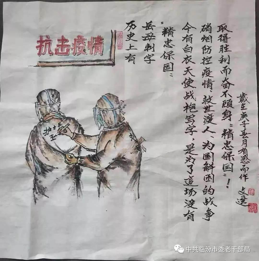 临汾市国资中心离退休干部认真贯彻落实疫情防控工作的安排部署,积极开展各项防控措施,按要求宅在家多通风、勤洗手、多消毒、不出门,在家争做火炬手。临汾市公安局离退休干部不断提升政治站位,始终关注疫情,充分发挥经验和优势,模范践行各项疫情防控工作要求,用实际行动教导子女,争做家庭防控的“指挥员”。尧都区老年大学学员、侯马市老年大学学员、乡宁老年大学学员以关注现实、聚焦当下、诗歌汇聚、书画创作的方式,为打赢疫情防控狙击战积极作为。安泽县离退休干部 “弘扬长者风范,当好防控“三员”,积极配合联防联控工作,用才艺作武器,以书画、剪纸、诗词、戏曲、朗诵、柔力球等多种形式,在微信群转发宣传,为奔赴在一线的逆行者加油鼓劲!洪洞县离退休干部群策群力、众志成城投入这场轰轰烈烈的群众战斗中,顶着寒风、守在村口,连夜编写快板彰显共产党员本色,为党旗添风采。