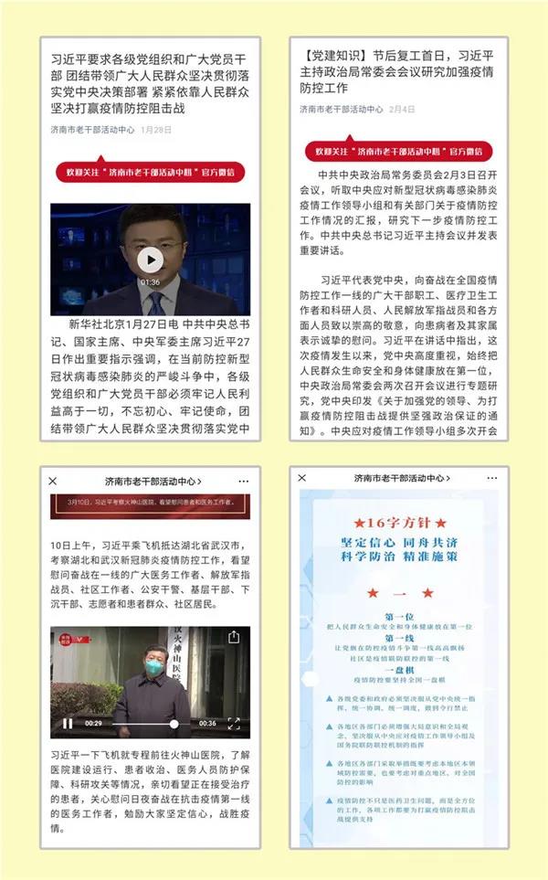 习近平总书记指示“各级党委和政府要坚决贯彻党中央关于疫情防控各项决策部署”。面对严峻复杂的局面,“网上老干部活动中心”通过济南市老干部活动中心微信公众号专门开设了“党建工作”栏目,引导广大离退休干部党员坚定不移贯彻落实习近平总书记重要指示和党中央决策部署,统一思想认识,牢记初心使命,并及时转发了中共中央政治局常委会会、中央全面依法治国委员会第三次会议、中央全面深化改革委员会第十二次会议等关于做好防疫工作的精神。