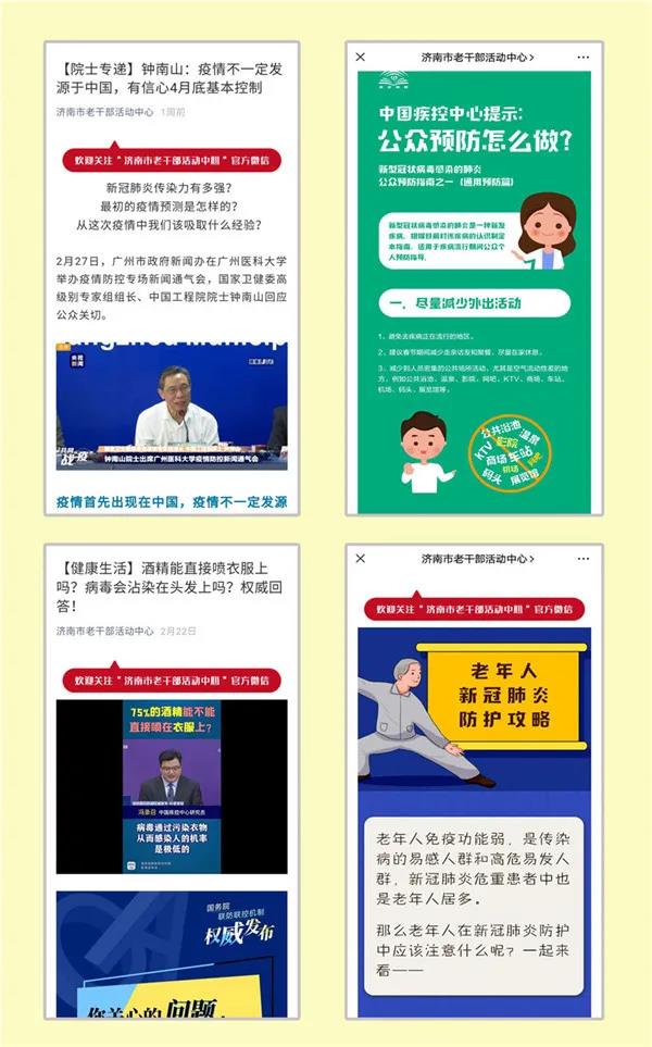 为使老同志了解掌握最及时、最准确、最专业的疫情信息,不听谣、不信谣、不传谣、不造谣,营造科学防治、理 性应对的社会氛围,“网上老干部活动中心”开设了“权威发布”和“院士速递”栏目, 及时转发人民网、新华社、央视新闻等权威媒体关于抗击疫情的最新动态和权威解读;开设“致敬,最可爱的人” 栏目,定期推送了工程院院士钟南山、李兰娟;“疫情上报第一人”张继先;武汉“快递小哥”汪勇;“鲲鹏战疫”运-20出征武汉等图文信息和视频,大力宣传逆行而上,奋战在一线的医务工作者、基层干部、人民解放军、公安民警、社区工作者、抗疫志愿者等先进典型事迹,展现全国各族人民坚定信心、同舟共济的坚强意志,激发老干部“老骥伏枥”,传递正能量,弘扬真善美的英雄气概。