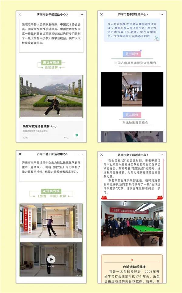 同时,根据不同老同志的兴趣爱好,还刊发了诸如台球、乒乓球、柔力球、象棋、声乐、舞蹈、书法、摄影、微信支付等专业讲座。其中,很多课件都是由兴趣爱好团队的授课老师、艺术顾问、骨干成员亲自撰稿和录制,深受老同志欢迎。
