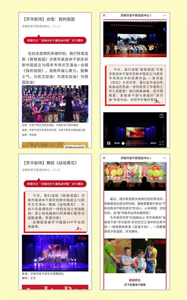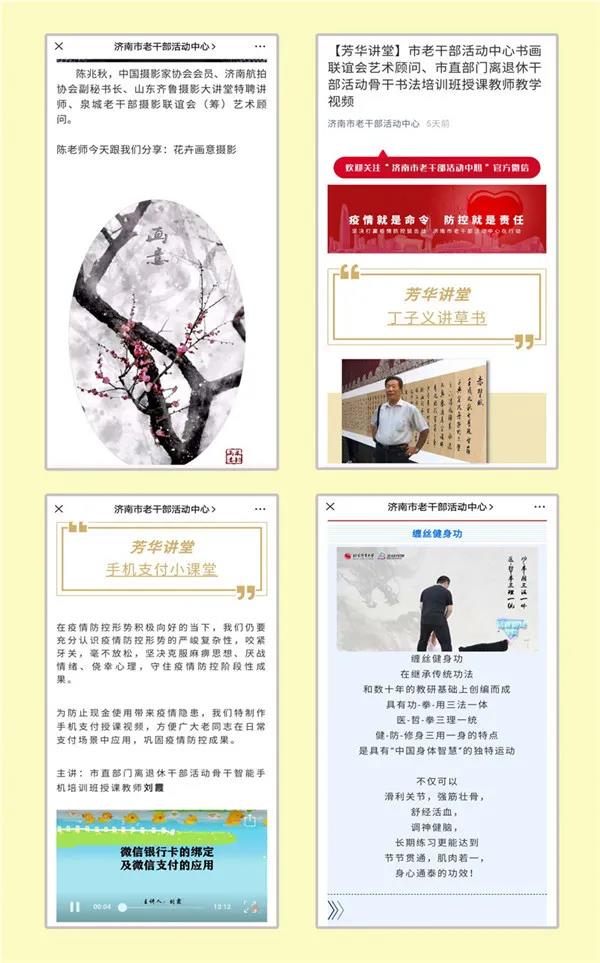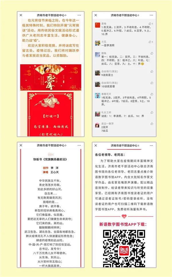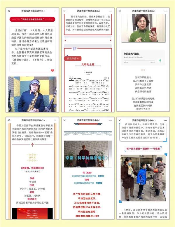 还联合市济南图书馆开设了“网上听书”栏目,向广大老同志重点推介新语数字图书馆APP,给读者带来知识与听觉的双重享受;与市曲艺团一起向老同志推送我市艺术家创作录制的战“疫”曲艺新作,用琴声鼓韵、简板丝弦诠释一曲曲新时代壮歌。