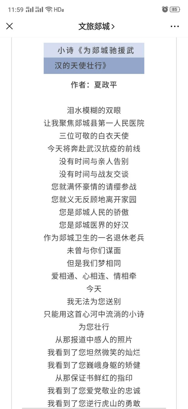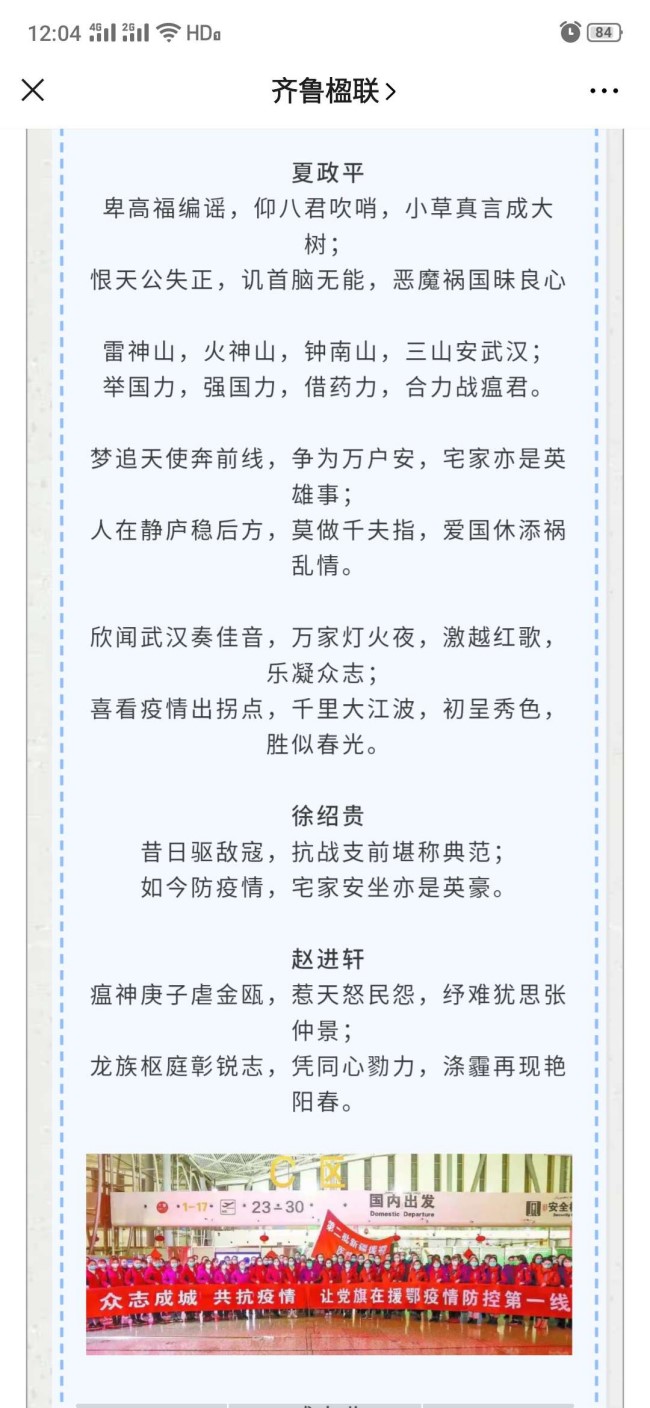 “上不了抗疫一线,就不要给一线添麻烦,要尽我们所能,多创作好的作品,为抗疫一线的英雄们加油、鼓劲!”山东郯城县“五老”志愿者协会副会长、县卫健局离退休干部党支部书记夏政平,在宅家避疫的日子里,充分发挥自己专长,以笔为戈,以纸为戎,创作抗疫诗歌60余首。