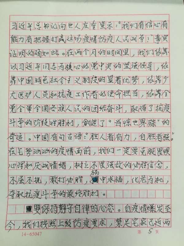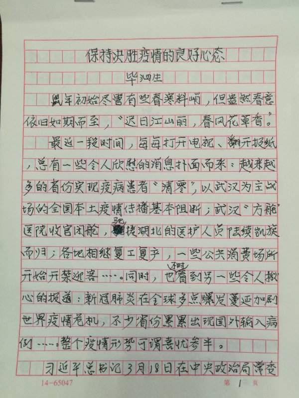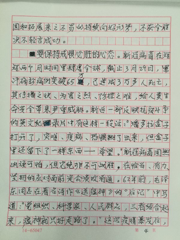 要保持戒惧必胜的心态。新冠病毒在短短两个月时间里肆虐全球,截止3月29日,累计确诊突破65万,已造成3万多人死亡,其传播之快、为害之烈、防控之难,给人类生命安全带来严重威胁。新近一部反映抗疫斗争的英文纪录片中有这样一段话:“潘多拉盒子打开了,灾难、疫病、恐惧跳了出来,但盒子里还留下了一样东西----希望。”新冠病毒固然凶顽可怕,但它绝非不可战胜,在恰当、有力、坚韧的应对面前定会溃败消遁。62年前,毛泽东同志在著名诗作《送瘟神》的“后记”中写道:“党组织、科学家、人民群众,三者结合起来,瘟神就只好走路了。”这次疫情爆发后,习近平总书记向世人庄重宣示:“我们有信心有能力有把握打赢这场疫情防控人民战争!”事实证明的确如此。在两个月的时间里,我们依靠以习近平同志为核心的党中央的坚强领导,依靠中国特色社会主义制度的显著优势,依靠广大医护人员和抗疫工作者的使命担当,依靠全党全军全国各族人民的团结奋斗,取得了抗疫斗争的阶段性胜利,创造了“当惊世界殊”的奇迹。中国有句古语:“胜人者有力,自胜者强。”在气势汹汹的疫情面前,我们一定要克服畏惧心理和厌战情绪,树立不畏强敌的必胜信念,不屈不挠,敢打必胜,祸中求福,化危为机,夺取抗疫斗争的最终胜利。