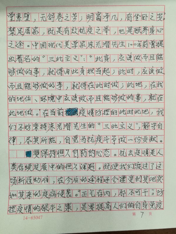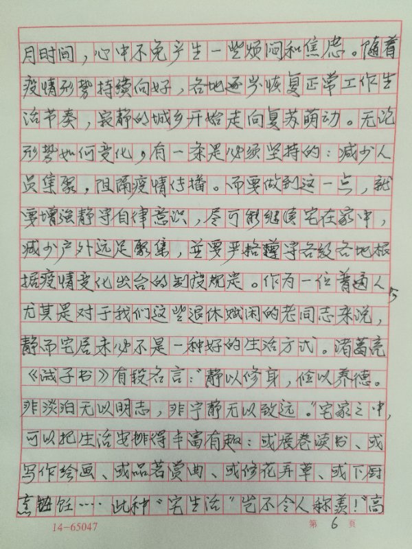 要保持静守自律的心态。自疫情爆发至今,我们按照上级防疫要求,禁足宅家已两月时间,心中不免产生一些烦闷和焦虑。随着疫情形势持续向好,各地逐步恢复正常工作生活节奏,寂静的城乡开始走向复苏萌动。无论形势如何变化,有一条是必须坚持的:减少人员聚集,阻隔疫情传播。而要做到这一点,就要增强静守自律意识,尽可能继续宅在家中,减少户外远足聚集,并要严格遵守各级各地依据疫情变化出台的制度规定。作为一位普通人,尤其是对于我们这些退休赋闲的老同志来说,静而宅居未必不是一种好的生活方式。诸葛亮《诫子书》有段名言:“静以修身,俭以养德。非淡泊无以明志,非宁静无以致远。”宅家之中,可以把生活安排的丰富有趣:或展卷读书、或写作绘画、或品茗赏曲、或修花弄草、或下厨烹饪……此种“宅生活”岂不令人称羡!“高堂素壁,无舒卷之劳;明窗净几,有坐卧之安。”禁足居家,既是有效抗疫之举,也是颐养身心之途。中国现代美学家朱光潜先生100年前曾提出著名的“三此主义”:“此身,应该做而且能够做的事,就得由此身担当起;此时,应该做而且能够做的事,就得在此时做;此地,在我的地位、环境中应该做而且能够做的事,就在此地做。”在当前疫情防控的此时此地,我们不妨秉持朱光潜先生的“三此主义”,静守自律,尽其所能,自觉为“抗疫”斗争作一份贡献。