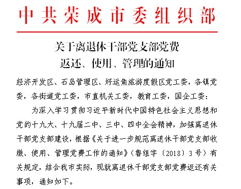 为全面提升离退休干部党建工作水平,近期,荣成市立足实际、精心谋划工作思路,采取党费返还、发放工作补助、建立社区报到制度等举措,切实推动离退休干部党建工作抓实抓细,取得实效。