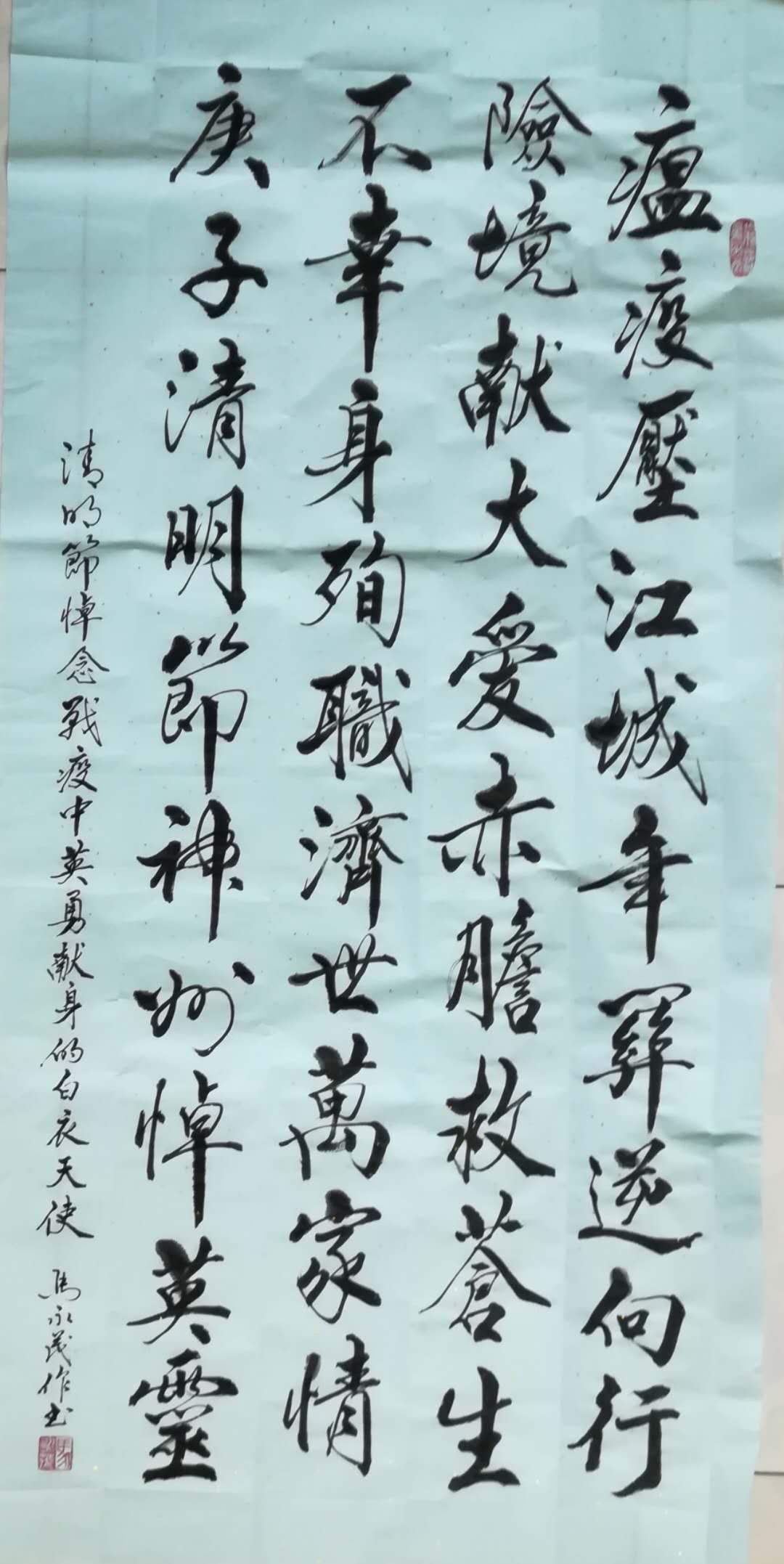 老年团体也积极响应文明缅怀号召,寄情书画表达追思,身体力行推行文明祭祀。省美术家协会会员、富锦市美术家协会副主席陈佰秋精心绘制了一幅国画,悼念战疫牺牲的英雄们。市地书协会创建发起人马永茂书写了多幅毛笔字作品,深刻缅怀周恩来总理、悼念战疫牺牲的白衣天使和战疫英雄李文亮。