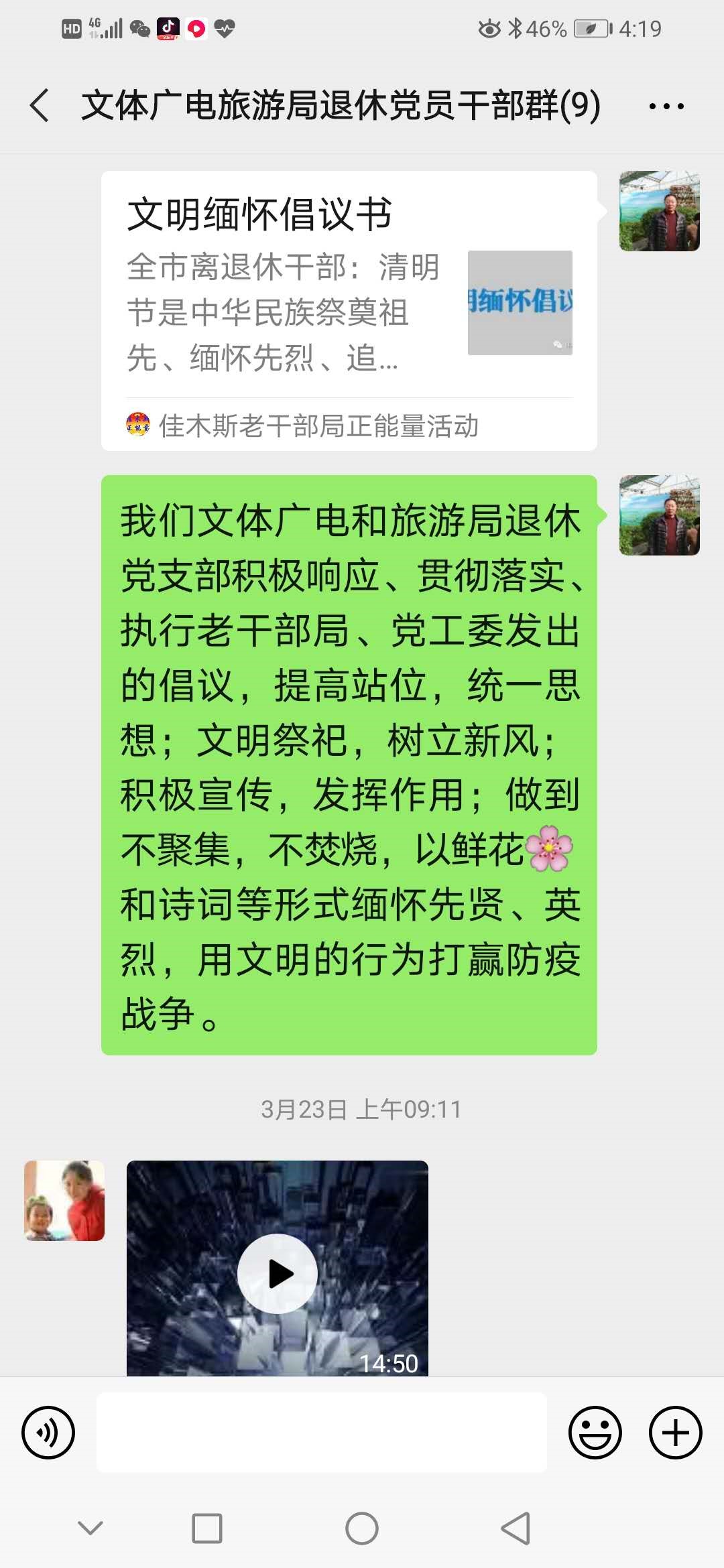 为了推行文明缅怀,倡导文明新风,维护优美整洁的市容环境,消除防控疫情期间的安全隐患,老干部局工作人员第一时间将文明缅怀倡议书转发到全市离退休干部党支部微信群,法院、文广新局、粮食局等40余个离退休党支部支部书记立即行动起来,在各自的党支部群转发,积极宣传,并纷纷表示坚决遵守执行,充分发挥党员的先锋模范作用,做文明祭祀的宣传员和监督员。