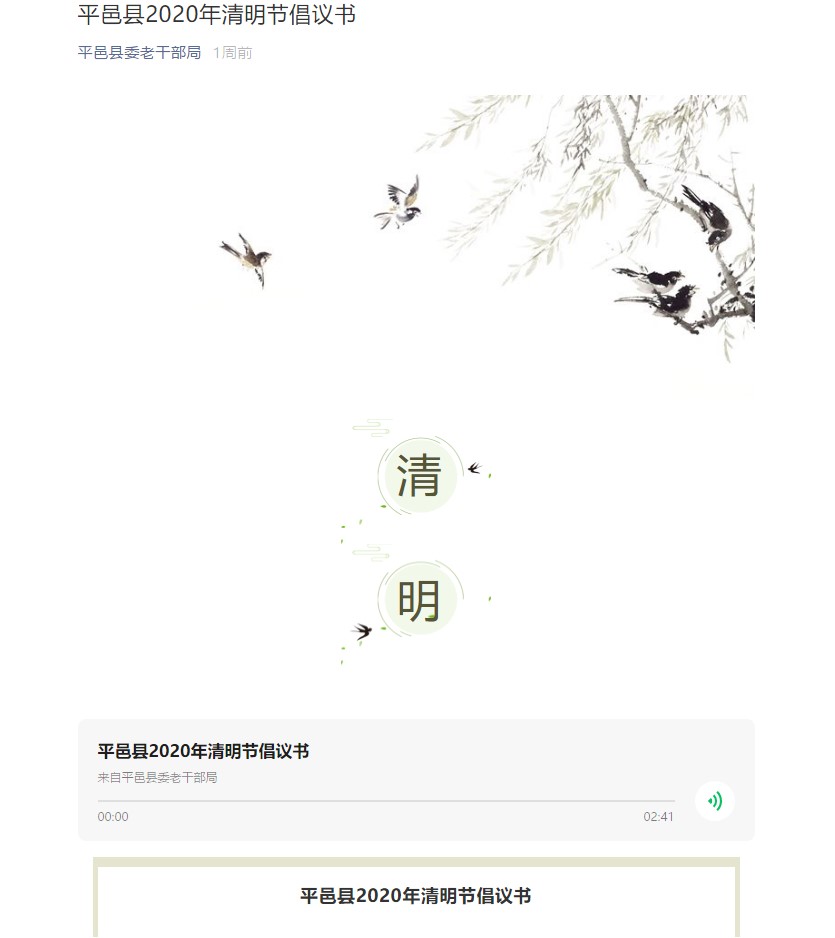 充分利用“平邑县委老干部局”微信公众号、微信工作群等方式向广大离退休老干部、老干部工作者宣传《平邑县2020年清明节倡议书》,倡导“文明祭扫平安清明”的理念,大力宣传疫情防控和清明节祭扫服务管理措施。
